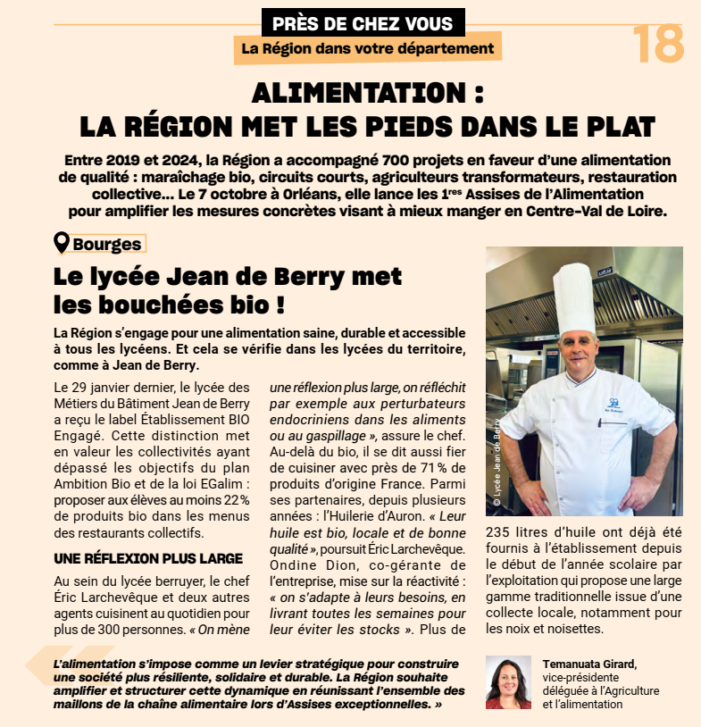 Le lycée Jean de Berry et particulièrement l’équipe de cuisine est mis à l’honneur dans le magazine de la Région Centre.