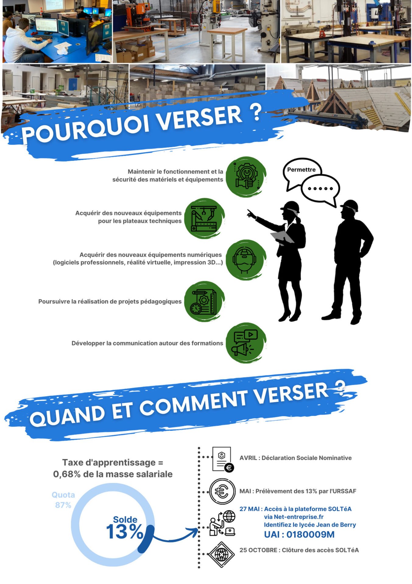 Le nouveau barème, appelé solde de taxe d’apprentissage, correspondant à 13% de la taxe, peut être versé à l’établissement. Pour ce faire, vous devez vous connecter entre le 27 mai et le 25 octobre sur la plateforme SOLTéA via Net-Entreprises.fr et désigner comme bénéficiaire le Lycée Jean de Berry avec le code 0180009M